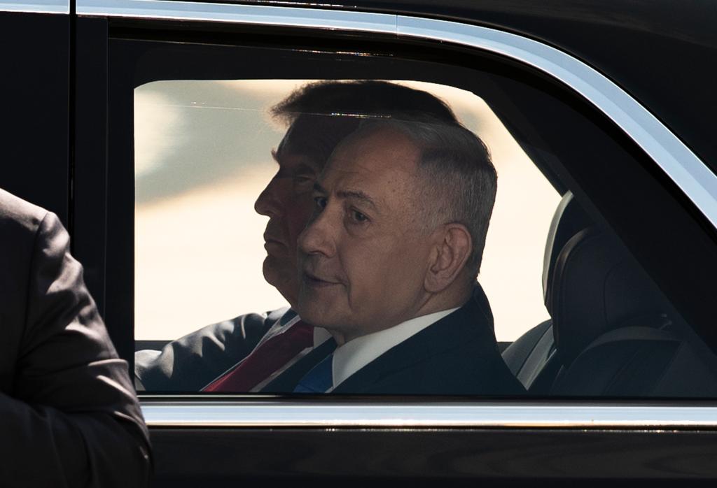10月13日,在以色列本-古里安机场,以色列总理内塔尼亚胡(前)同到访的美国总统特朗普同乘一辆车。新华社记者 陈君清 摄