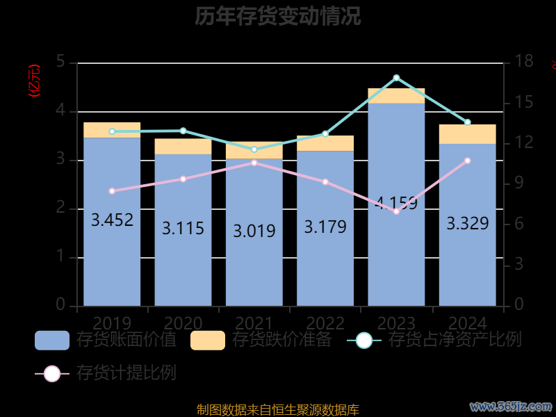 从存货变动来看,截至2024年末,公司存货账面价值为3.33亿元,占净资产的13.58%,较上年末减少8295.45万元。其中,存货跌价准备为4004.17万元,计提比例为10.74%。